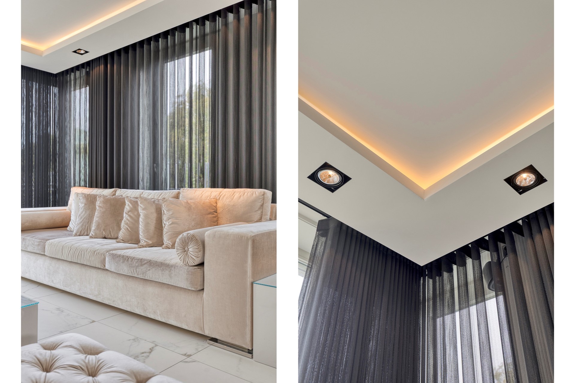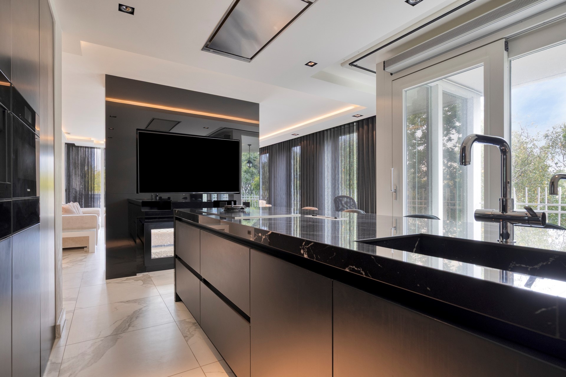 De cinewall is een sfeermaker bij binnenkomst. Deze scheidt op prettige wijze de woonkamer en keuken van elkaar zonder inbreuk te doen aan het interieur en is aan beide kanten voorzien van een tv scherm met onderin de sfeerhaard.