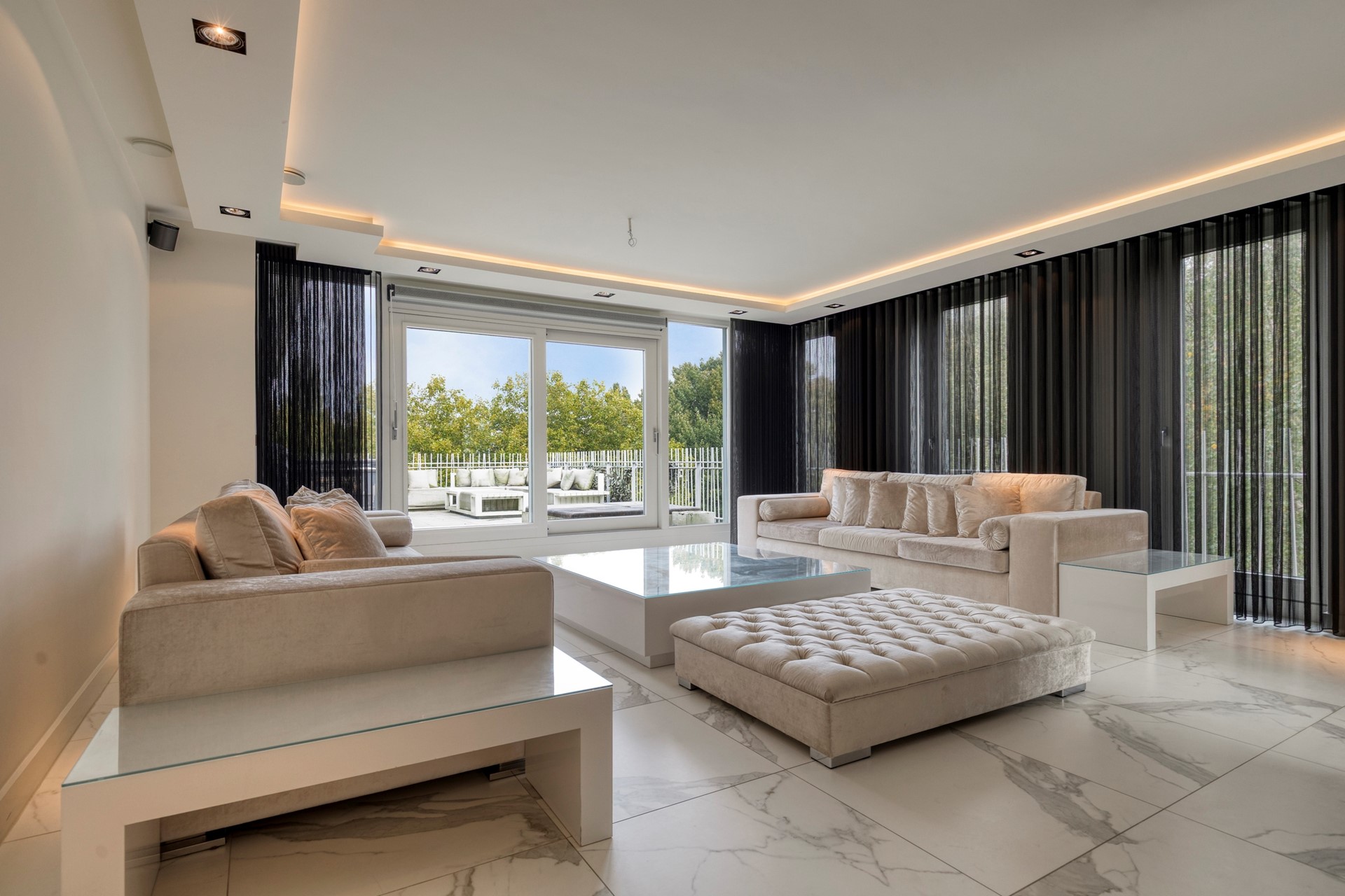 De royale woonkamer met zicht op het terras vormt het hart van de woning en biedt via de schuifpui directe toegang tot het indrukwekkende terras dat in de warmere maanden een verlenging van de woonkamer kan zijn, perfect voor een gezellige barbecue.