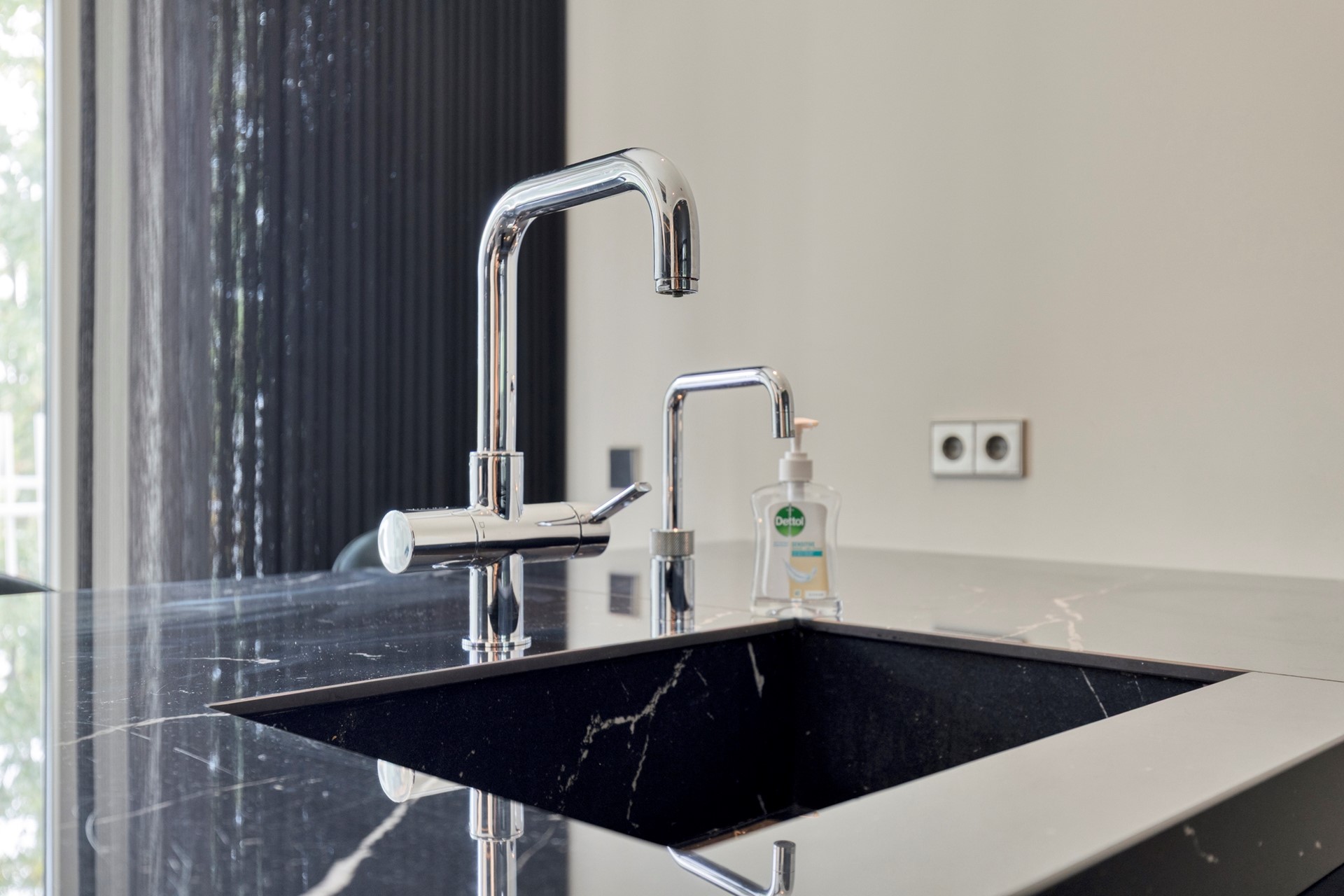 De keuken met eiland is stijlvol afwerkt en niet alleen een lust voor het oog, maar ook volledig uitgerust met hoogwaardige (Miele ArtLine) inbouwapparatuur waaronder: een vaatwasser, koelkast, afzuigkap, stoomoven, combimagnetron, koffiemachine en inductie kookelement met wokbrander, kortom een keuken die van alle gemakken is voorzien.