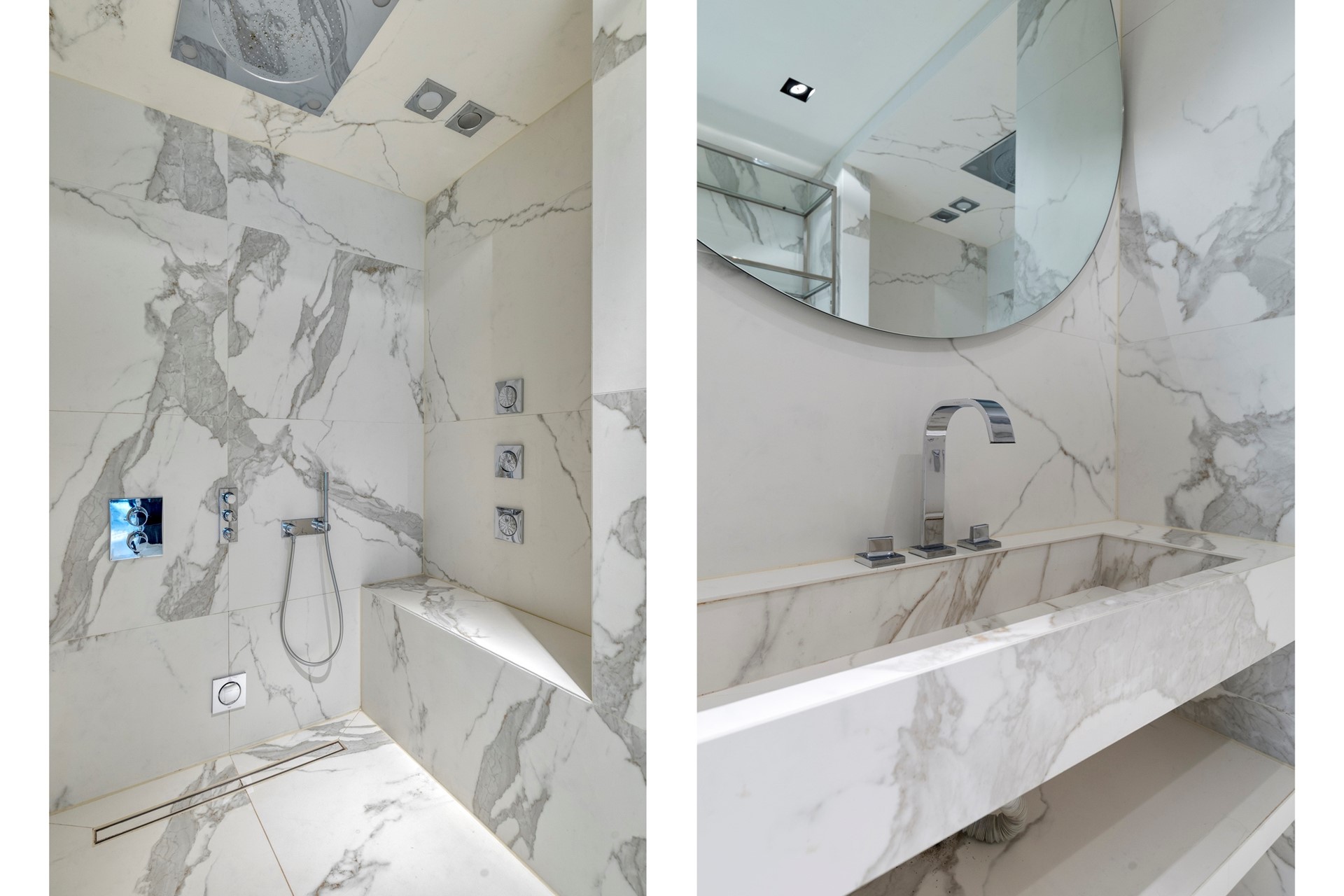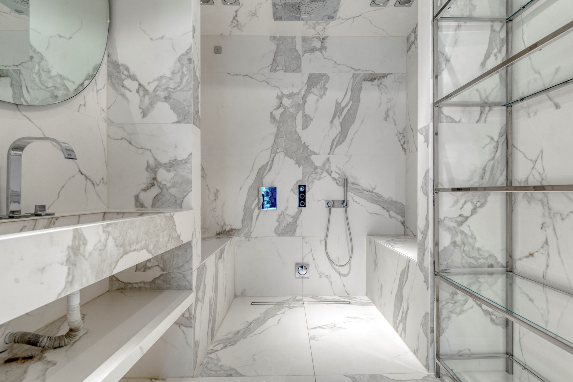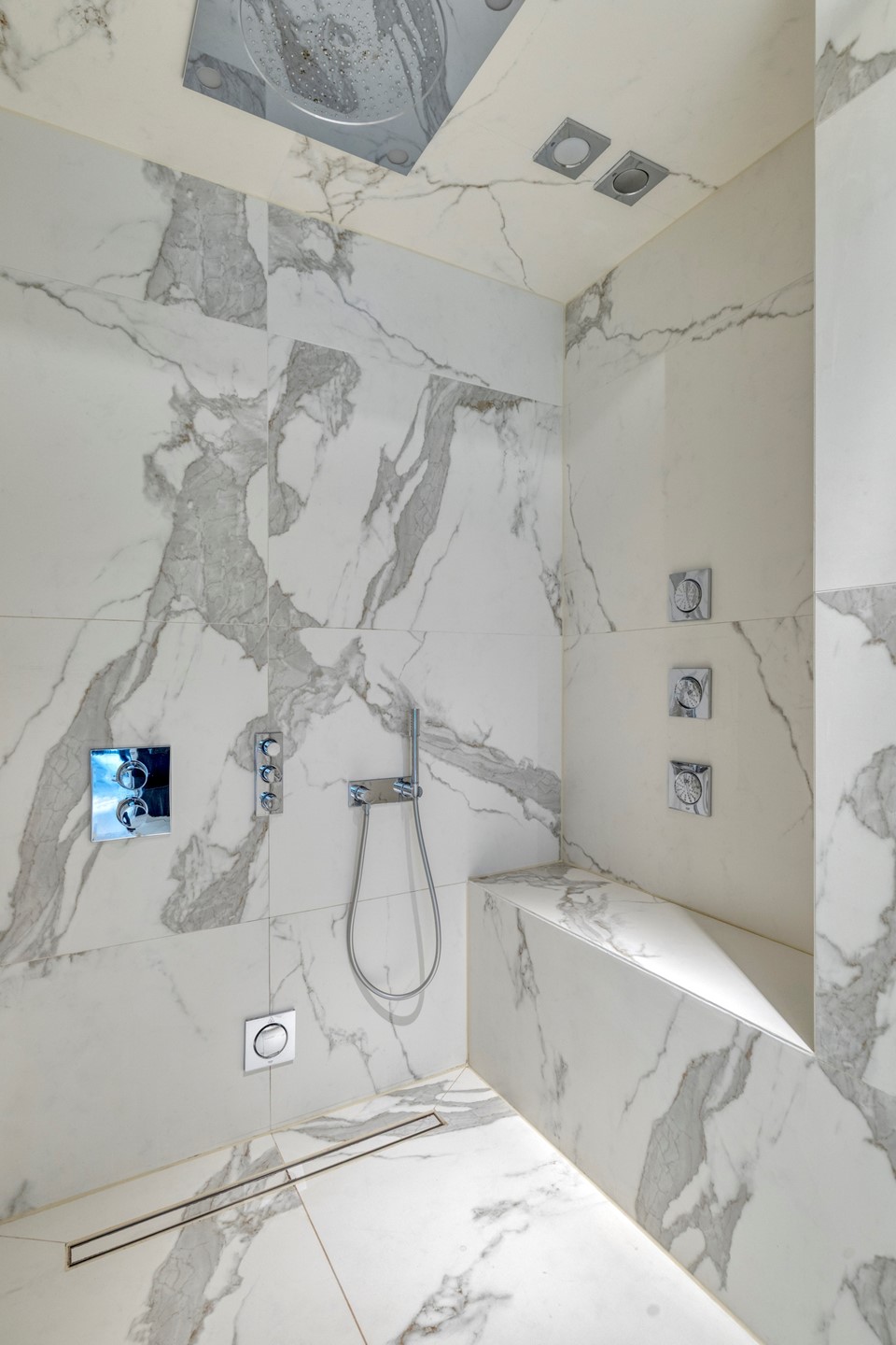 Moderne badkamer welke is voorzien van een ruime inloopdouche met ingebouwde jets aan weerszijden, regendouche